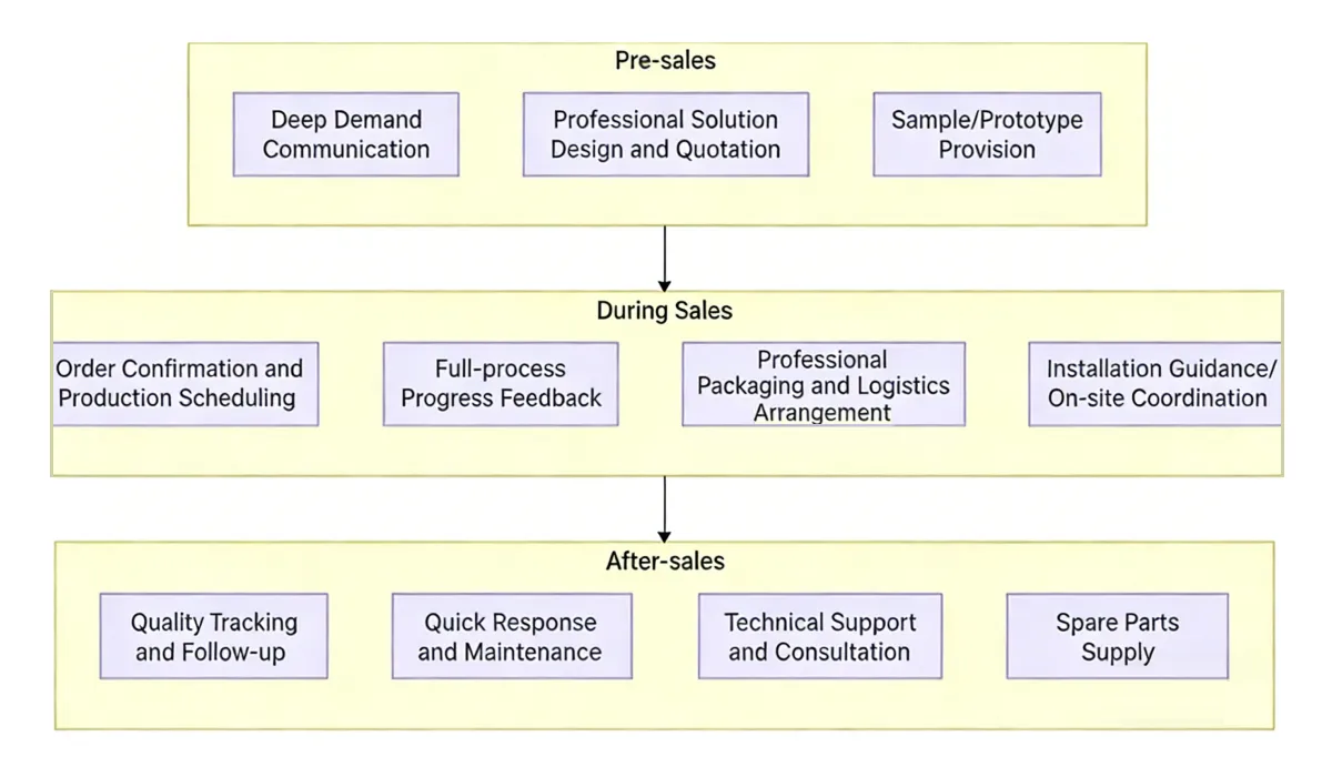 ऑर्डर की पुष्टि के बाद, YeHaoXuan एक समर्पित उत्पादन कार्यक्रम शुरू करेगा, जिससे आप वास्तविक समय में प्रगति को ट्रैक कर सकेंगे; उत्पादन के बाद, हम पेशेवर पैकेजिंग और विश्वसनीय लॉजिस्टिक्स का उपयोग करते हैं, और सुचारू उत्पाद वितरण सुनिश्चित करने के लिए इंस्टॉलेशन मार्गदर्शन और आवश्यक ऑन-साइट सहायता प्रदान करते हैं।